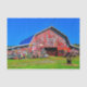 Grande celeiro vermelho cercado por coleções num dia cegamente brilhante.