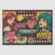 This decoupage paper features a bold comic pop art collage with women’s faces, lips, and eye illustrations in a high-contrast graphic style. The design includes the words “Love,” “Strength,” and “Hope” layered over harlequin diamond patterns, hearts, and grunge paint textures.