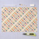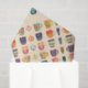 Diversas xícaras coloridas de café e chá com diferentes padrões florais e cardíacos são dispostas em um padrão repetitivo contra fundo branco. Cada xícara apresenta uma combinação única de cores e designs, criando uma exibição vibrante e simétrica.