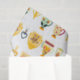 Diversas xícaras coloridas de café e chá com diferentes padrões florais e cardíacos são dispostas em um padrão repetitivo contra fundo branco. Cada xícara apresenta uma combinação única de cores e designs, criando uma exibição vibrante e simétrica.