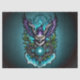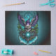 Coruja com elementos mágicos. A design apresenta uma coruja impressionante e estilizada com suas asas espalhadas por toda parte, projetada em uma paleta de cores vibrantes de roxo, azul e branco. A coruja expele uma presença majestosa, enquanto seus olhos amarelos piercing olham diretamente para o espectador, criando um senso de intensidade e mistério. Padrões insípidos e giratórios se desdobram em torno da coruja, lembrando símbolos mágicos, dando à imagem geral uma aura mística.