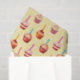 Papel de tecido doce com padrão de cupcake colorido sobre fundo de bolinhas amarelo claro.
