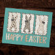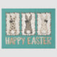 These cute coquette bunnies feature animal print and checkerboard patterns, and cute hand-drawn brown bows in shades of brown and tan. Happy Easter is printed in playful type and coordinating colors underneath. The background is a stylish teal green.