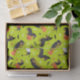 Dachês bonitos em trajes de bruxa e trick-or-tratando com patas, morcegos e ossos de cachorro em fundo verde-claro.