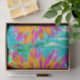 Esta Pintura Digital Original a Óleo do Meu Jardim Rubio apresenta uma Flor de Dália Decorativa Laranja e Rosa Quente com Acentos em Azul Turquesa, Magenta, Turquesa, Verde Lima, Chartreuse e Aquamarino. O resultado é uma pintura floral de dália colorida, abstrata e deslumbrante que você vai amar!