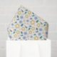 Flores azuis e amarelas douradas desenhadas à mão cobrem um fundo branco salpicado de folhas verdes e com pontinhos cor-de-rosa fofos.