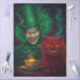 An eccentric character dressed in vivid emerald attire shares a mysterious moment beside a steaming teacup while a mischievous crimson feline companion grins nearby. Swirling smoke and glowing light create a magical atmosphere that feels lifted from a strange and whimsical tale. Rich colors, dramatic expressions, and playful fantasy details give the artwork a theatrical storybook quality filled with curiosity and imagination. This imaginative illustration blends fantasy charm with surreal storytelling, making it perfect for creative décor and artistic themed collections.