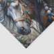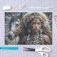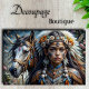 Este retrato impressionante combina elementos de fantasia e inspiração indígena em uma exibição deslumbrante de detalhes ornamentais e poder espiritual. A composição combina magistralmente um nobre corcel com uma figura adornada, ambos embelezados com uma parafernália intrincada que apresenta acentos de turquesa, ouro e prata. O rosto do sujeito ostenta delicados padrões cerimoniais azuis que refletem os elementos decorativos de seu elaborado traje, enquanto seu cocar combina girassóis, flores brancas e penas em uma coroa régia.