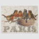 Cinco pequenos Robins europeus sentam-se juntos sobre um galho que ignora um ninho e a palavra "Paris" em belíssimas letras embelezadas. O padrão do ornamentado de safra no fundo vem de uma tapeçaria bordada antiga. Três tamanhos diferentes disponíveis para desacoplamento ou transferência de móveis.