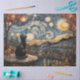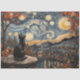 Um gato negro olhando para um céu noturno cheio de estrelas em uma vila tranquila.