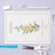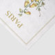 Papel de tecido para desligar que se parece com uma página de título francesa antiga com uma ilustração de flor de foxglove amarela no centro e a palavra "Paris" no topo. Dourado texto e borda.