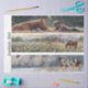 A soulful and scenic three-panel collage designed for 26x6 handsaw decoupage, celebrating the quiet strength and beauty of horses across rustic landscapes. The top panel captures an intimate winter moment—a cowboy lying face-to-face with a resting brown horse in a snowy field. The middle panel features two horses grazing near a red barn, surrounded by wildflowers and evergreen trees under a cloudy sky. The bottom panel bursts with motion as five horses gallop through a snow-covered forest, their energy contrasting the serene backdrop. Each horizontal design blends emotion, nature, and storytelling—perfect for transforming vintage blades into powerful wall art.