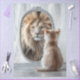 This powerful image features a small, light brown and white kitten sitting on a wooden floor, gazing into an ornate vintage mirror. But in the reflection, the kitten doesn’t see itself—it sees a majestic lion with a full mane, staring back with quiet strength. The soft, textured white wall behind the mirror adds a gentle contrast to the bold symbolism.