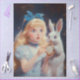 The image depicts a little girl with long blonde hair, wearing a blue headband and a light blue dress, holding a golden pocket watch. Next to the character is a white rabbit with large eyes, also holding a pocket watch. The dark background, filled with glowing particles, creates a magical and whimsical atmosphere. The scene evokes themes of fantasy and adventure, reminiscent of classic fairy tales.