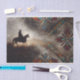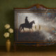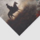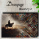 Transforme móveis e espaços comerciais com nosso papel de decoupagem premium do sudoeste. Este design tradicional apresenta padrões geométricos inspirados nos nativos e uma silhueta de cavalgada contra um fundo trabalhado em prata. Este design cria um ponto focal elegante perfeito para casas do sudoeste, museus culturais ou espaços inspirados em cowboy.