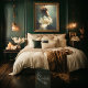 The moody teal, sage, and warm gold background envelops the figure in an atmosphere of quiet mystery, making this design a perfect centrepiece on furniture, frames, journals, or decorative wall panels. The flowing gown and dreamlike composition bring a romantic, fantastical quality that works beautifully in both contemporary and vintage-inspired interiors.