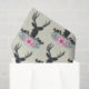 Papel de tecido com uma cabeça de cervo preto com grandes chifres. Linhas geométricas dentro na face do veado acrescentam um toque criativo. Flores cor-de-rosa e folhas verdes de menta formam um bonito buquê floral abaixo de sua cabeça. Um esboço de serra colocado entre as flores também agrava o sentimento rústico do país.