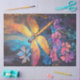 A imagem é uma pintura vibrante e colorida de uma libélula em meio a uma variedade de flores. A libélula tem asas iridescentes com tons de amarelo, laranja e rosa, e um corpo que transita de azul para roxo. As flores em torno da libélula estão em tons de rosa, roxo e azul, com detalhes intrincados e efeito brilhante. O fundo é uma mistura de cores escuras e brilhantes, criando um contraste impressionante que destaca a libélula e as flores. Essa imagem é interessante devido ao seu uso vívido de cores e à representação detalhada e quase etérea da libélula e flores, fazer que ela cativa visualmente e atrativa artisticamente. Pintura vibrante de libélula, flores coloridas, asas iridescentes, corpo azul a roxo, detalhes intrincados de flores, efeito brilhante, contraste de fundo escuro e brilhante, libélula etérea e flores, visualmente cativante, atrativo artisticamente.