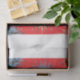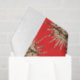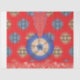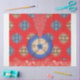 O design apresenta um padrão fractal espantoso. No centro, há um motivo circular em azul e branco, cercado por intrincados designs em tons de laranja, marrom e azul. O fundo é um vermelho rico com padrões de estrelas douradas espalhadas por toda parte. Este desenho fractal simétrico é visualmente cativante e simboliza frequentemente uma complexidade infinita, seja em matemática, natureza ou arte.
