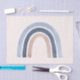 Papel tecidular com um arco-íris fofo e caprichoso. Aquarelas azuis e de pêssego.