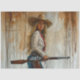 A imagem mostra uma pintura de uma vaqueira vestida como xerife. Ela está vestindo um chapéu grande e largo com costura decorativa, uma camisa de manga longa e clara, com bolso no peito, e uma bandana vermelha ao redor do pescoço. Ela tem cabelos longos e ondulantes escorrendo pelas costas. A vaqueira está segurando uma espingarda com as duas mãos e tem um cinto com um coldre ao redor da cintura. O fundo da imagem apresenta um desenho abstrato texturizado com listras verticais de vários tons de castanho e bege. A estética geral captura a presença robusta e autoritativa de um xerife ocidental, combinada com a força e a determinação de uma vaqueira. Xerife de vaquinha com espingarda, chapéu largo, costura decorativa, camisa de manga longa de cor clara, bandana vermelha, cinto de segurança, fundo de abstrato, estética ocidental robusta e autoritativa.