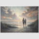 Esta cena costeira magistralmente renderizada captura um momento íntimo de contemplação no limiar entre a terra e o mar. A composição conduz o olhar através de um portal naturalista de gramíneas de dunas sopradas pelo vento, levando a duas figuras que compartilham um momento profundo contra uma paisagem marinha dramaticamente iluminada. A paleta é particularmente notável - apresentando dourados e âmbares luminosos que perfuram azuis ardósia sofisticados e cinzas de estanho, criando uma atmosfera etérea que parece suspender o próprio tempo.