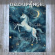 Entra num mundo de magia com este magnífico papel de tecido Celestial Unicórn a desligar. Apresentando um gracioso unicórnio branco a dançar entre estrelas ouros e tons sonhentos de azul-da-noite, esta design é perfeita para adicionar um toque de fantasia aos seus projetos criativos. Ideal para decoração de móveis, caixas, bandejas e objetos de madeira ou cerâmica, traz uma aura encantadora e mística às suas criações feitas à mão.