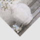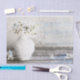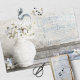 Belo design com flores brancas em um vaso branco com efemera vintage em tons de azul e cinza.