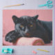 Uma majestosa pantera negra está elegantemente num sofá rosa.