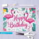 Celebre em estilo com nossa divertida design de aniversário tropical apresentando ilustrações lúdicas de flamingo! Essa trabalho de arte vibrante e pré-projetada traz um brejo de paraíso tropical para qualquer partido com cores brilhantes, palmeiras e flamingos alegres.