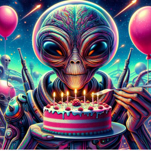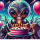 Engraçado alienígena extraterrestre comendo bolo de aniversário com balões que fazem aniversário de Gift Bags.