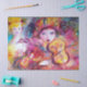 Amor romântico entre Arlecchino e Colômbia. Colorido, violino branco, uma linda loira em fantasias espumantes de penas, única, pintor de aquarela artística,mascarada de veneziana, com lindas espirais florais em brilhos dourados, azul-aqua, verde-vermelho, rosa, amarelo-dourado, cor violeta,cores iridescentes,ouro e folha de prata de Búlgaro Lumini (c) Este design legal e artístico também é bonito para ocasiões especiais, aniversários, natal, feriado, Dia de os namorados, Mardi Gras (Fat Terça-feira),