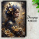 Transforme seu projeto com Autumn Enchantress Floral Gold Blue Decoupage da Decoupage_Boutique. Um retrato caprichoso de uma jovem coroada com flores de outono e botânicos dourados traz elegância, mistério e charme de fantasia para qualquer peça. Ideal para decoração romântica, de conto de fadas ou temática floral.