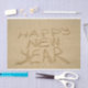 Este design apresenta uma imagem do texto "FELIZ ANO NOVO" escrito na areia com um pau.