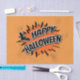 A ilustração do estilo cômico Feliz de Halloween com decoração de design de texto, morcego e estrelas em fundo de meia-tona. É possível mudar a cor de fundo e adicionar uma diferente à design com sua escolha.