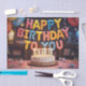 A vibrant and joyful digital illustration of a classic birthday celebration. The scene features a delicious white frosted layer cake decorated with colorful sprinkles and topped with a large number of lit candles. Above the cake, a banner of bright, multi-colored foil balloons spells out "HAPPY BIRTHDAY TO YOU". The festive atmosphere is enhanced by floating balloons, swirling ribbons, and scattered confetti against a warm, softly blurred background.