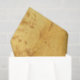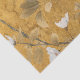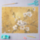 Um trabalho de arte floral impressionante, com flores delicadas de cereja branca, contra um fundo amarelo ouro.