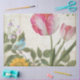 "Flores de Tulipas de Girassol Papel Tecido de Decoupage de Ave Ephemera, peso pesado para desacoplamento de móveis, arte de parede ou invólucro de presentes." Esta é uma pintura em estilo pintado criada em um pastel de petróleo. Um girassol amarelo brilhante é emparelhado com Tulipas francesas cor-de-rosa no jardim com um pássaro azul, flores silvestres e folhagem foliar sobre a efemera da escrita manual e um fundo brando. Toda a trabalho de arte foi pintada por uma artista e designer internacionalmente licenciada, Audrey Jeanne Roberts, copyright.
