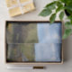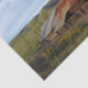 Um celeiro de madeira de prata e telhado vermelho, enfiado num belo campo de girassol com papel de tecido de colinas verde.