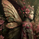 Uma fada envolta em pétalas macias de cor rosa e asas cintilantes. Seu traje brilha como se iluminado por uma luz suave de luar, evocando uma sensação de encantamento sereno e noturno. Ótimo para decoração soft vintage ou shabby.
