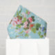 Buquês mistos de rosas cor-de-rosa e amarela, inspirados na safra muito bonito, glórias da manhã azul e hidrangeas, vinhas verdes, margaridas rosa e púrpura e flores silvestres, folhas verdes e ferrugem com delicado padrão de folhas brancas sobre fundo azul-céu.