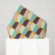 Geometric pattern with overlapping half-circles in teal, cream, brown, and peach on an orange background, creating a vibrant and retro feel.