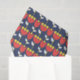 Este elegante design apresenta flores geométricas vermelhas e amarelas em fundo azul marinho.