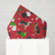 Cães de Natal bonitos em roupas festivas de férias. German shepherd com casacos brancas, pretas, pretas e bronzeadas, pretas e vermelhas, pretas e prateadas vestem chapéus de Santa, galhadas, suéteres em fundo vermelho com ornamentos dispersos.