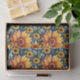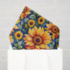 Esta imagem mostra um padrão com girassóis amarelos brilhantes com folhas verdes sobre um fundo azul escuro. Os girassóis são renderizados num estilo detalhado e vibrante, criando um contraste visualmente impressionante com o pano de fundo escuro.