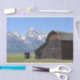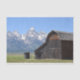 Grande madeira preta e celeiro de tijolos castanhos num campo verde com montanhas de boné com areia jageada no fundo sob um céu azul brilhante.