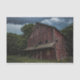 Grande celeiro vermelho de vários andares com uma floresta densa no fundo sob papel tecidular do céu tempestuoso para embrulho de presentes e/ou projetos de dissociação.