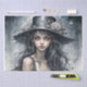 Explore o mundo encantador da dissociação com esse projeto de artesanato com uma bruxa-mulher enfeitada de chapéu preto e cabelos longos e pretos, fundidos em delicadas aquarelas. Perfeito para o Dia das Bruxas ou para melhorar a remodelação de móveis, esta peça capta o fascínio místico da estética gótica
