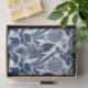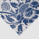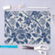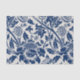 Intricate blue floral pattern on a light background, featuring stylized blooms and curling leaves, evoking a vintage, elegant feel.