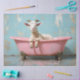 Uma pintura branca com uma cabra branca com chifres relaxando numa banheira rosa vintage, colocada contra uma parede azul clara para uma encantadora e divertida cena rústica.
